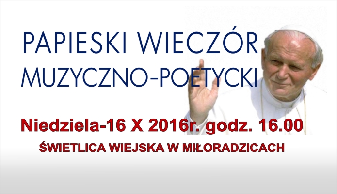 13 października 2016KONCERT PAPIESKI – 16.10.2016 W najbliższą niedzielę zapraszamy do świetlicy wiejskiej w Miłoradzicach na wieczór słowno-muzyczny ku czci Jana Pawła II – […]